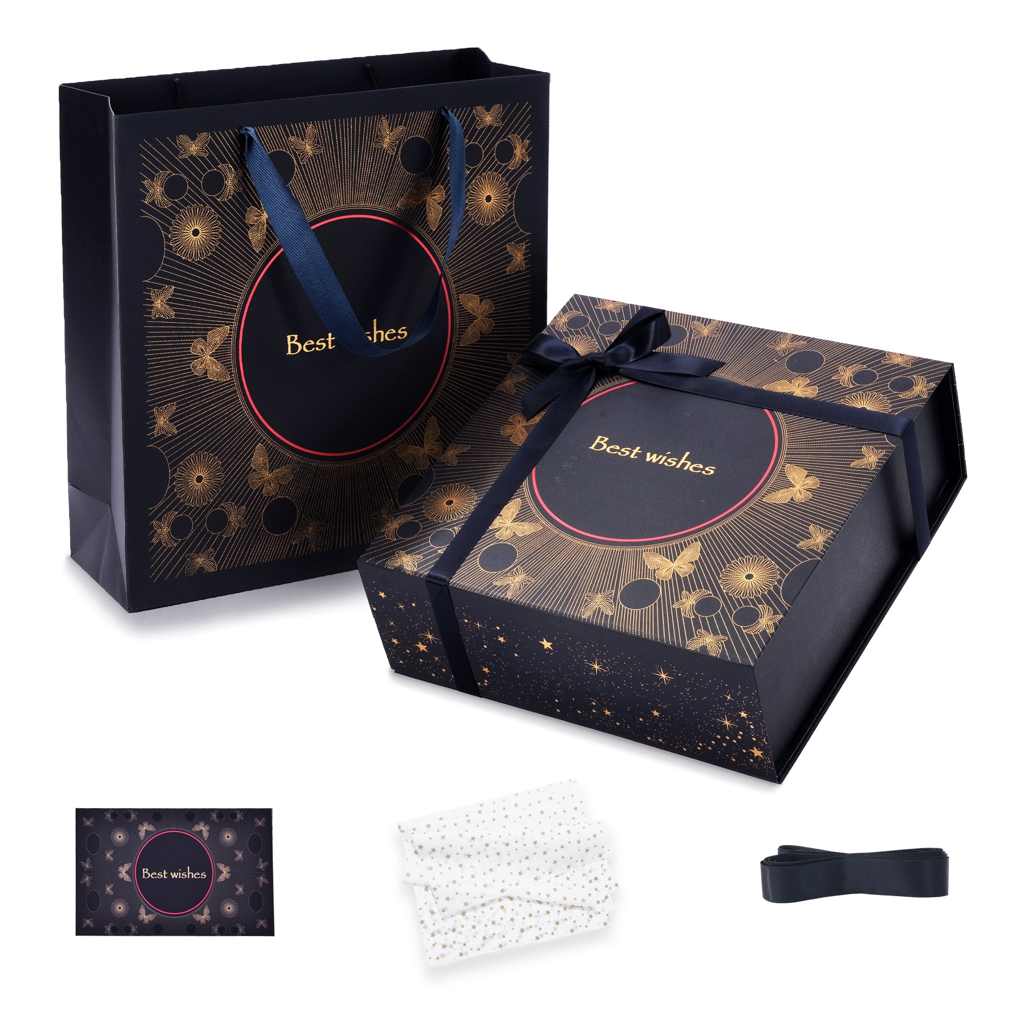 This ultimate set has everything! I wasn't sure if I needed both the box and the bag, but it's great to have options. The box is for the main gift and the bag can hold the card and some extra goodies. All the accessories are top-notch.