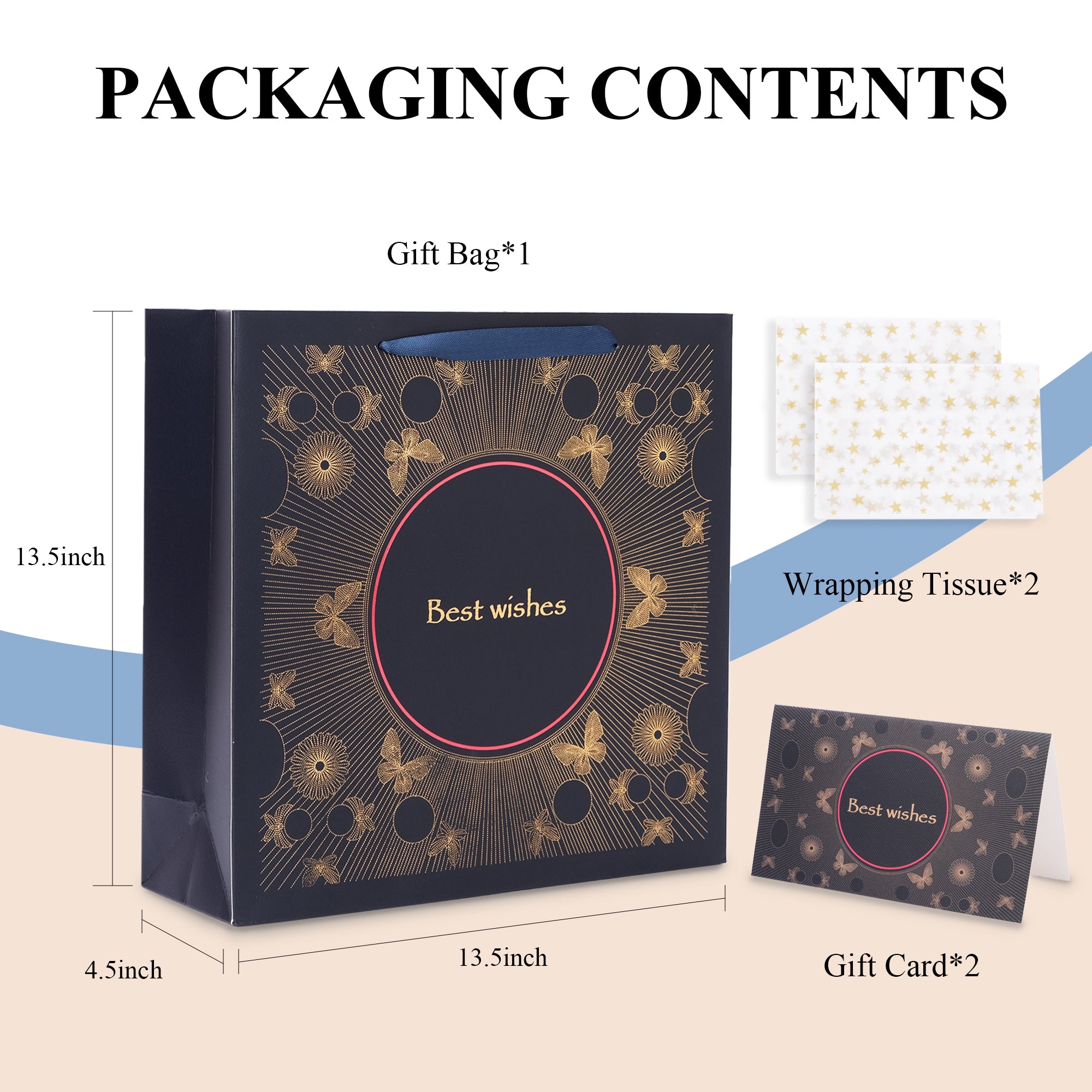 ELEGANT BLUE GIFT BAG SET - This set includes 1 blue gold gift bag (13.5x13.5x4.5 inches), ideal for various gift-giving occasions. It also comes with 2 sheets of high-quality wrapping tissue and a greeting card, providing everything you need for beautiful, hassle-free gift presentation.