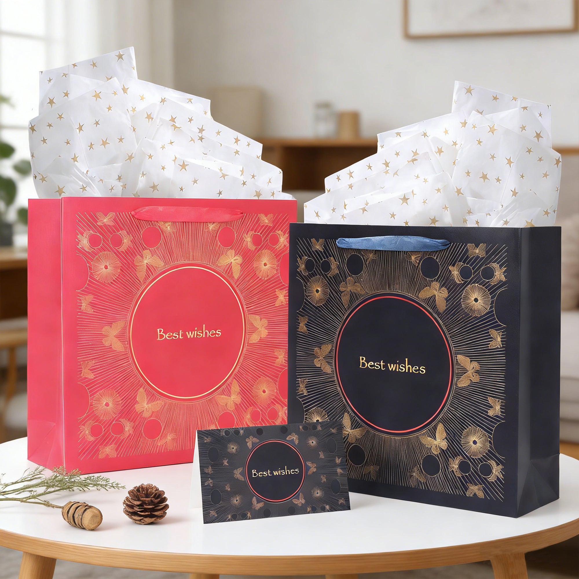 COMPLETE GIFT PACKAGING SOLUTION - Save time and effort with this all-in-one gift packaging set. The bag, tissue paper, and greeting card work together to create a cohesive and attractive presentation, eliminating the need for extra wrapping paper or complicated packaging.