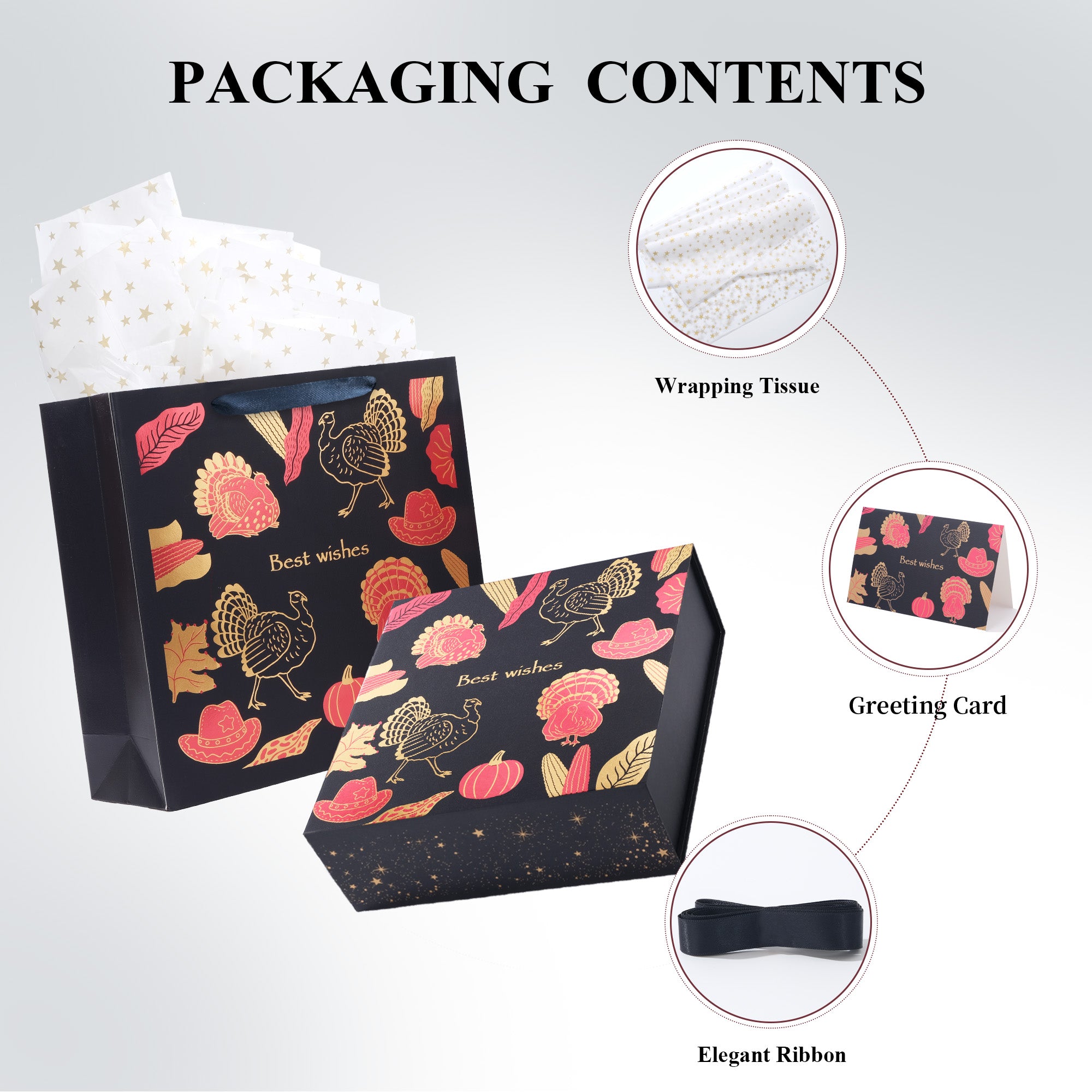 This large gift box set includes everything you need for effortless gifting: 1 sturdy 12 x 12 x 4 inch gift box, 1 matching 14.5 x 14.5 x 4.5 inch gift bag, 2 sheets of wrapping paper, 1 greeting card, and 1 elegant ribbon. No need to buy separate gift wrapping supplies — beautifully coordinated and ready to impress.